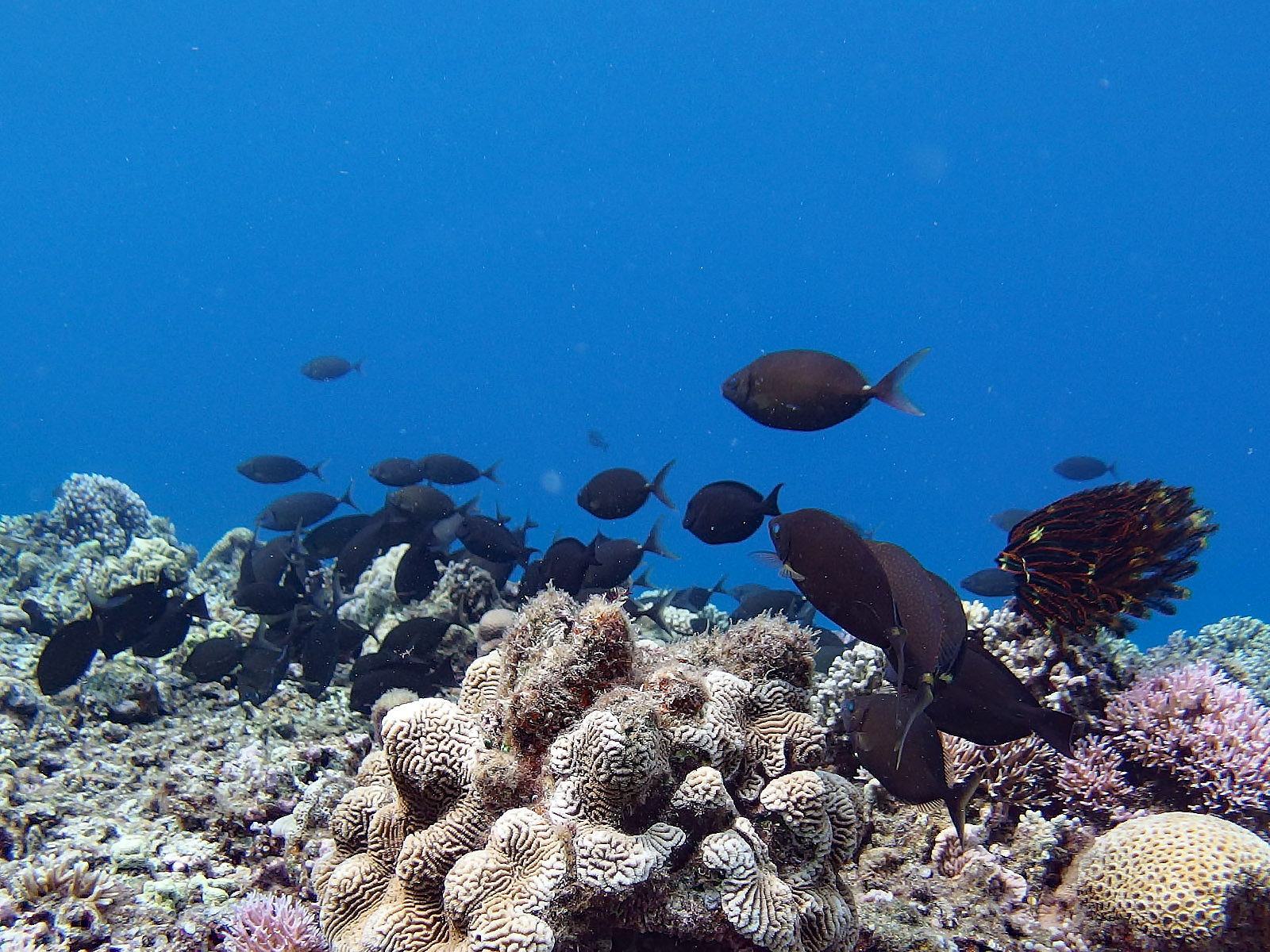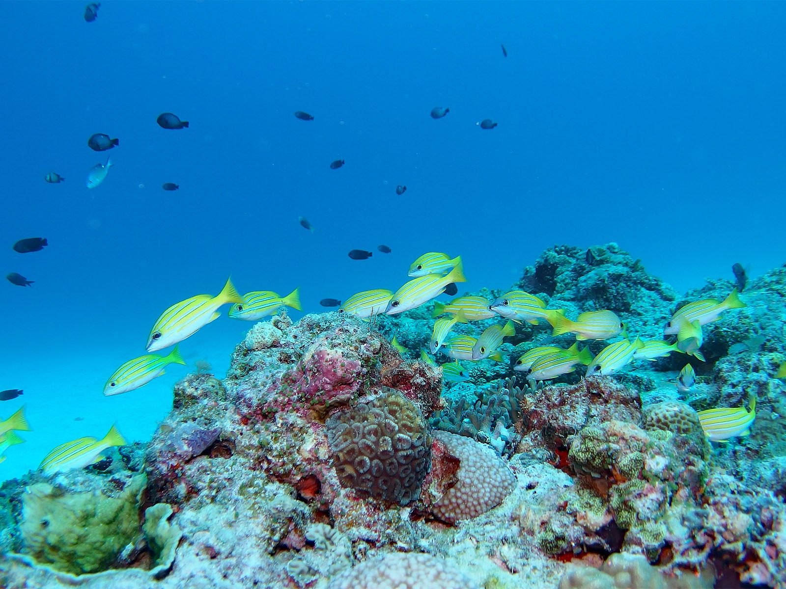 今回2回目のウルンノサチだけれど、ちょっとコースを変えればまた違った風景が。ヨスジフエダイの黄色が真っ青なブルーに映えてきれい。