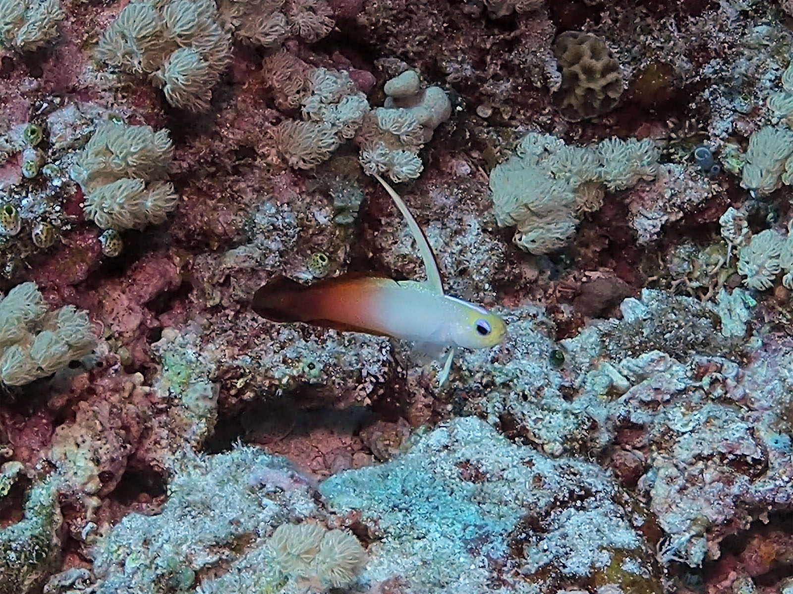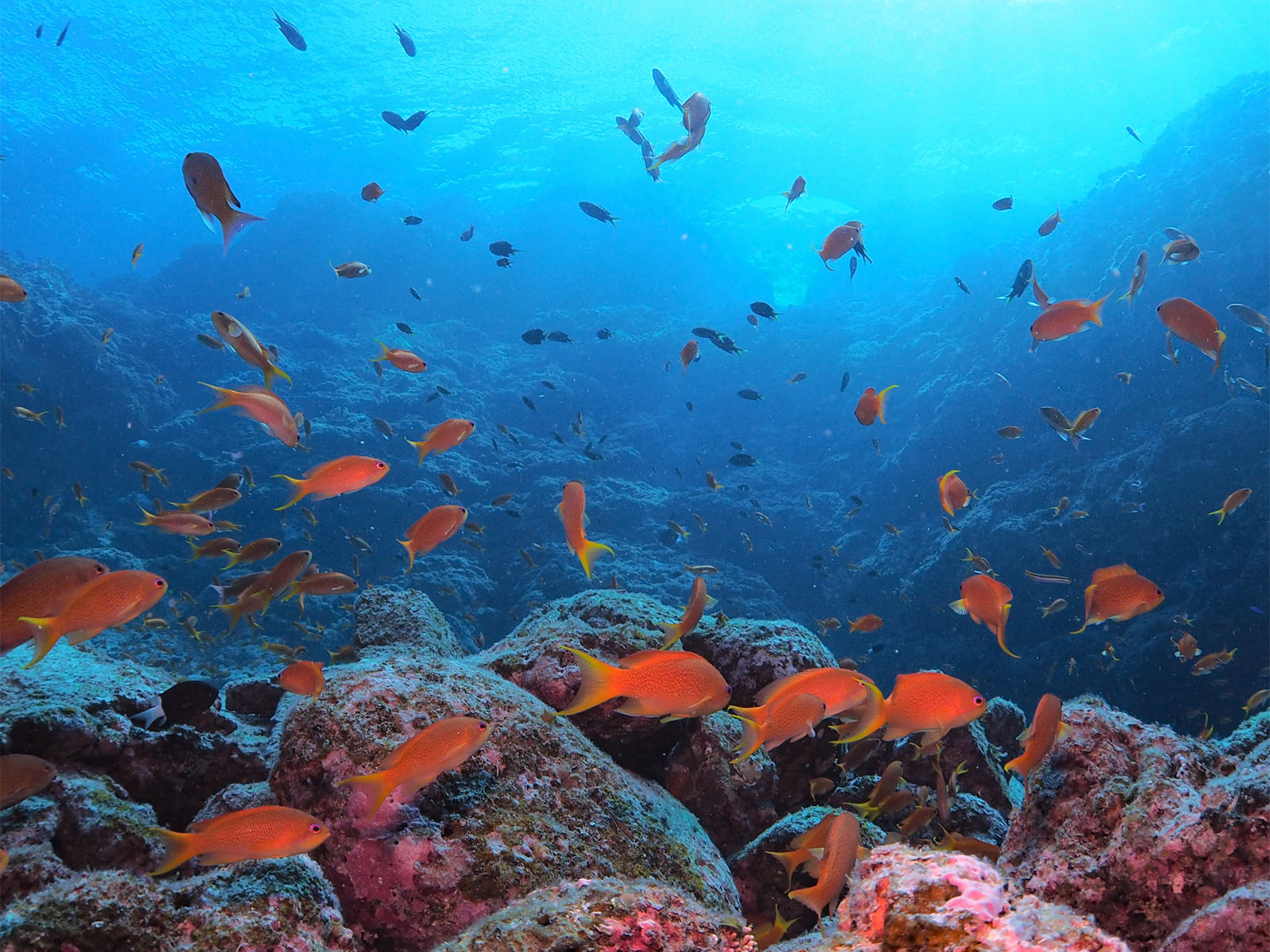いつきてもキンギョハナダイの群れがすごい平瀬、今回も期待を裏切らずたくさんいました。 上の一番左がエントリしたところで、このすぐ近くにいつものキンギョハナダイがいる、きれいですね~