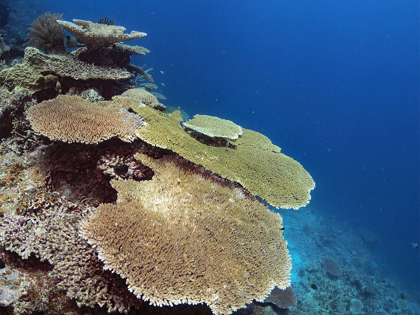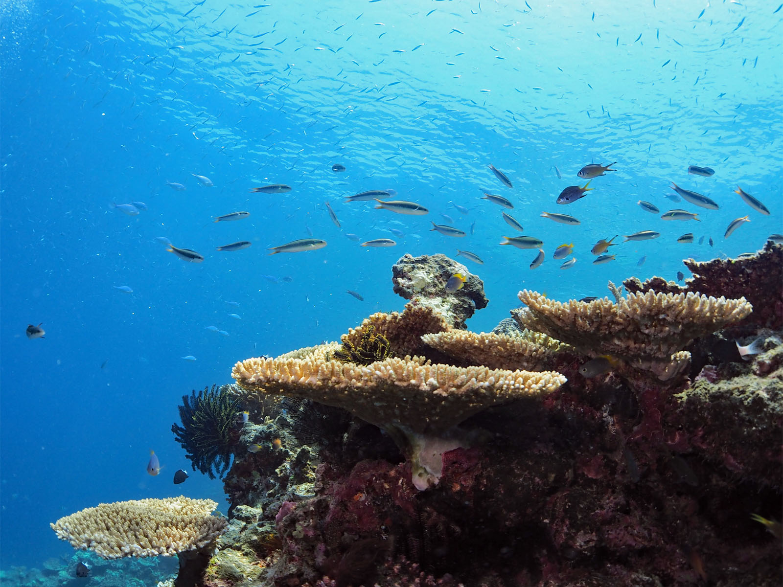 テーブルサンゴがきれいなんだけど、、、、、、 エントリしたのが根のちょうど流れが当たるところで、根の左に行っても右に行ってもどんどん流されてやっと岩につかまっている状態(頑張って写真は撮ったけど)。まったく楽しめず、ただ時間が過ぎていくのを待っているだけで、どう考えてもこんなところに潜るのは船長のミスジャッジとしか思えない。いっそのことドリフトにしてくれれば良かったのに。う~ん。。。。。