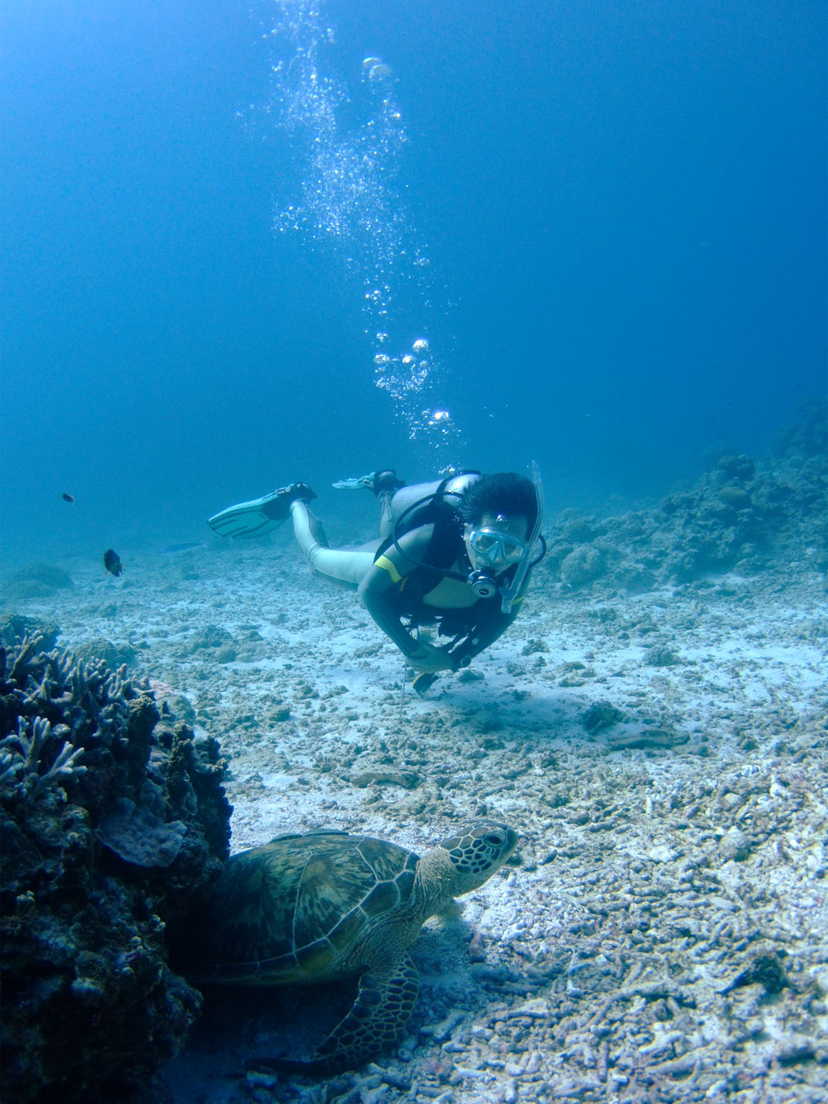 今回ゲストが自分一人だったので、カメラを渡してダイビング雑誌に載っているような写真を撮ってくださいとリクエストしました。ガイドさん曰く、こんなリクエストは初めてとのこと。ウミガメとのランデブー写真も撮れてラッキー!
