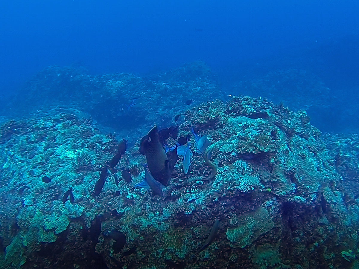 イソマグロはあまり見れなかったけど、ナポレオンやらカスミアジやらハマフエフキ、ナガニザ、さらにはウミヘビまでが一つの群となって何か(何かの魚の卵らしい)を貪り食っているような光景が見れて、これはこれですごかった。こんなの見たの初めて。(右の写真)